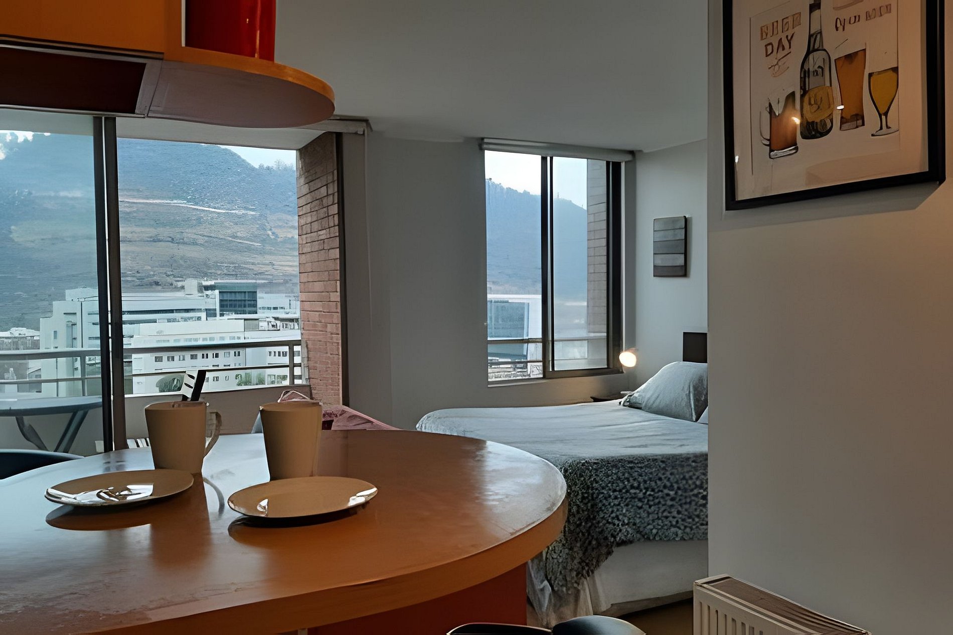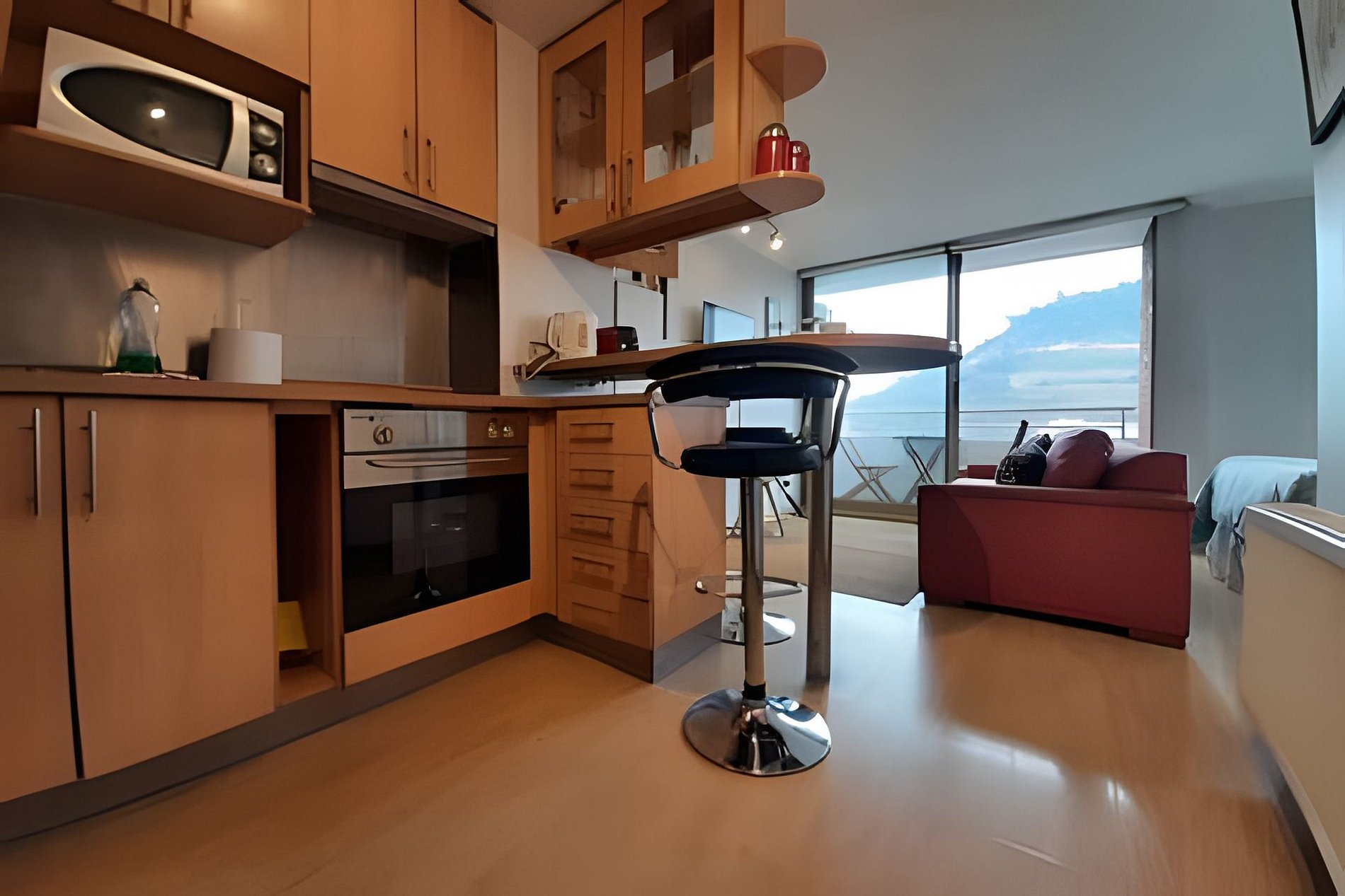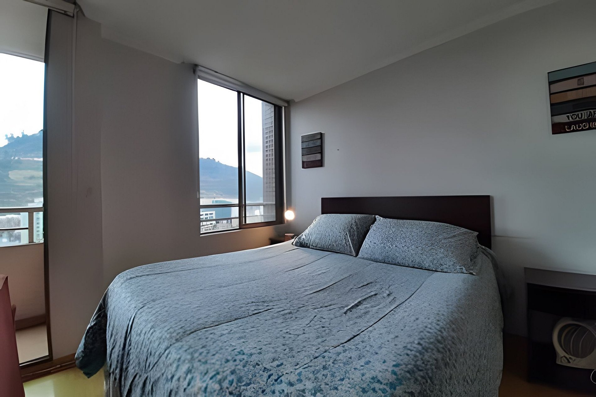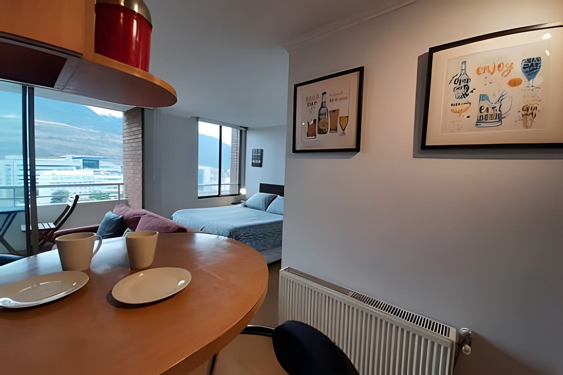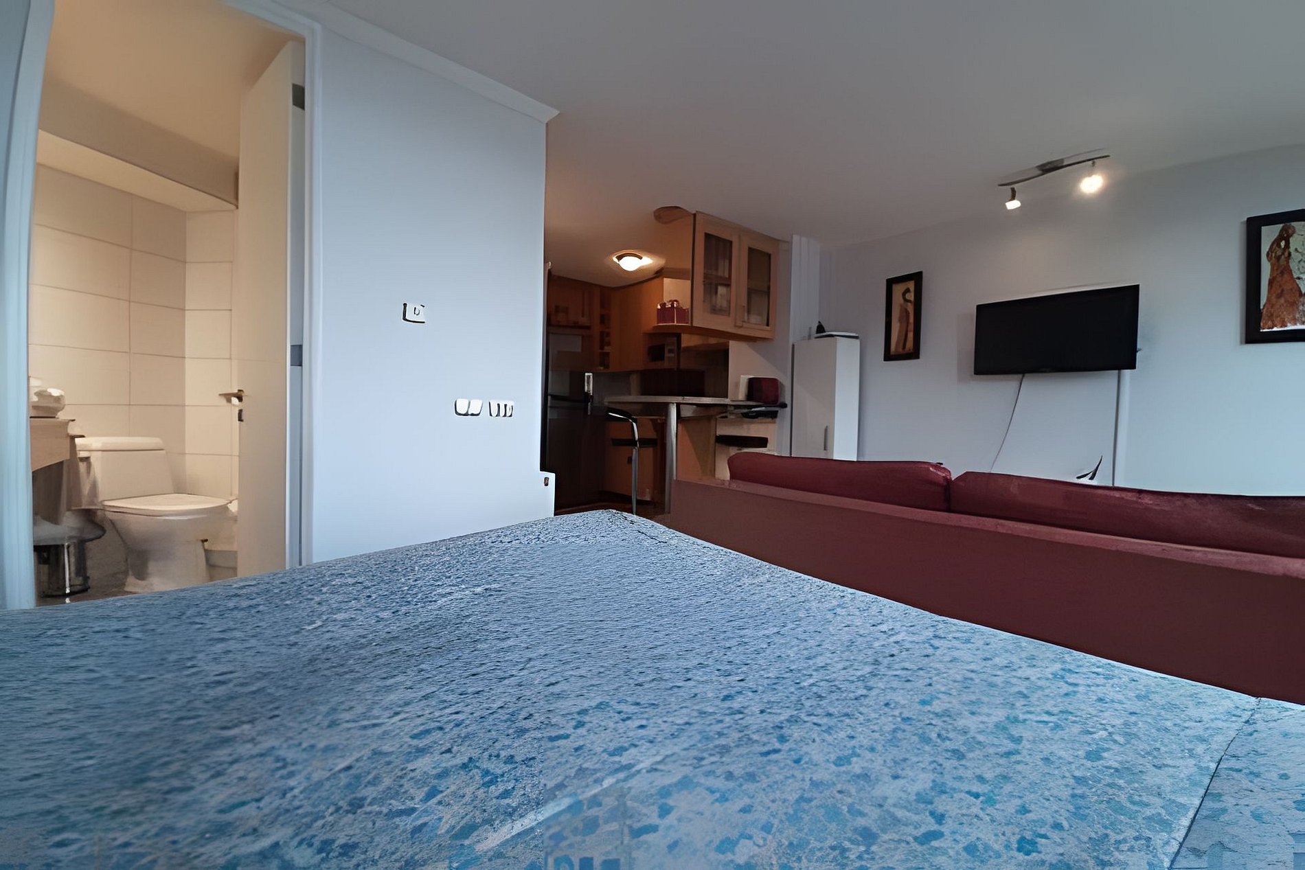 Providencia con Condell. One-room apartment, one double bed and one double sofa bed. One bathroom with shower over bathtub, fully equipped kitchenette, one balcony. Free WiFi in the apartment. Fan, electric stove, towels, iron, hair dryer and bed linen included. Closed and paid parking in the same building, subject to availability. It is located on the 14th floor of a modern building.