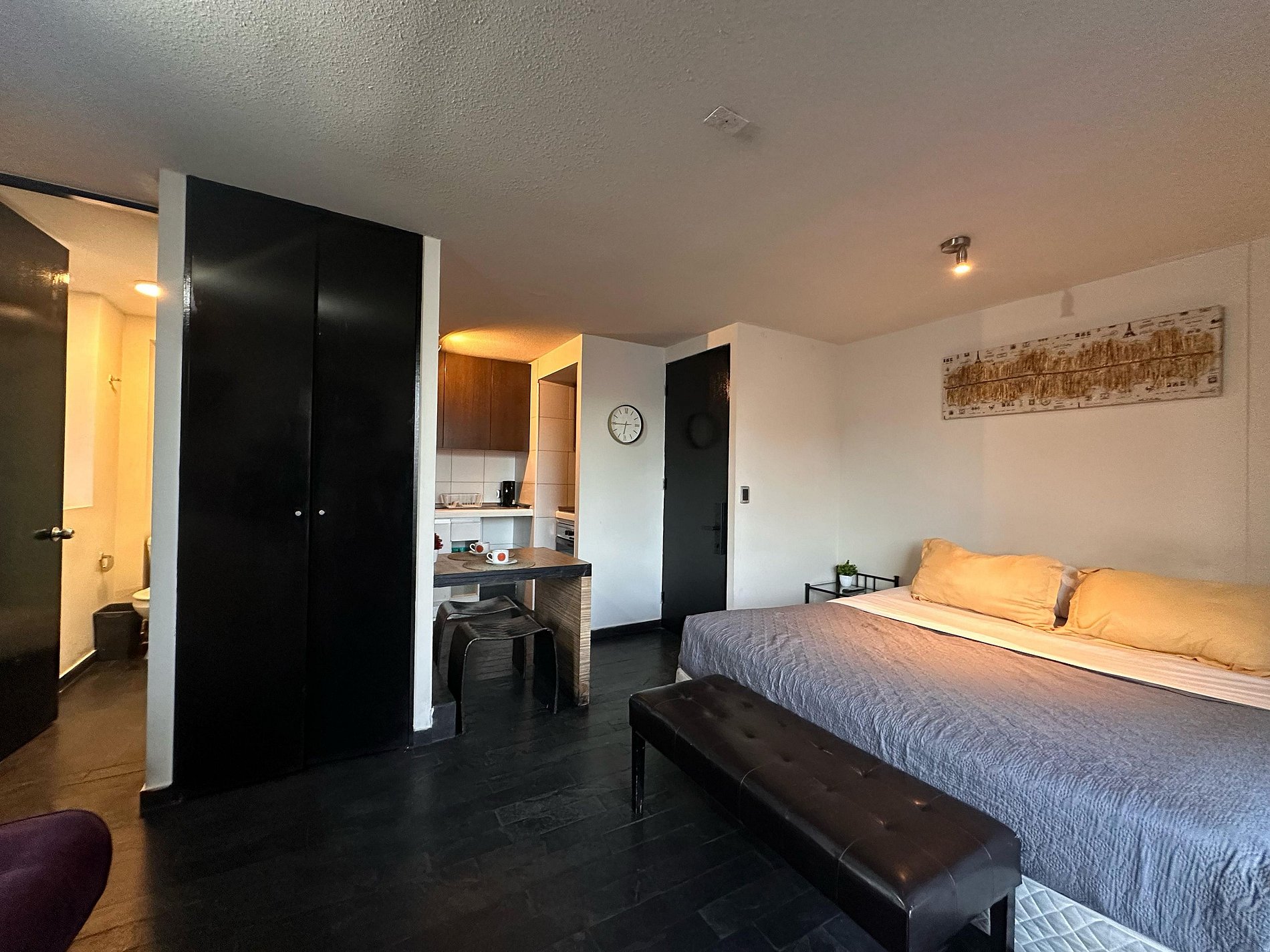 Avenida Portugal, Santiago Centro, Santa Isabel metro station 350m away, Católica metro station 700m away. Studio with double bed, one full bathroom, equipped kitchenette. Free WiFi in the apartment. Fan, electric stove, towels, iron, hair dryer and bed linen included.