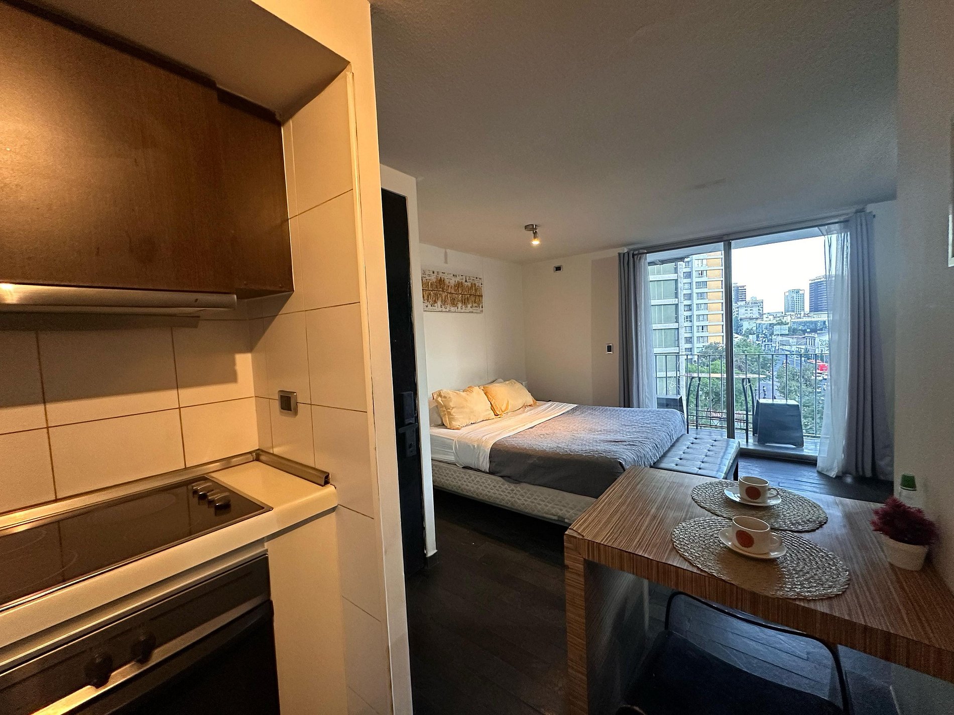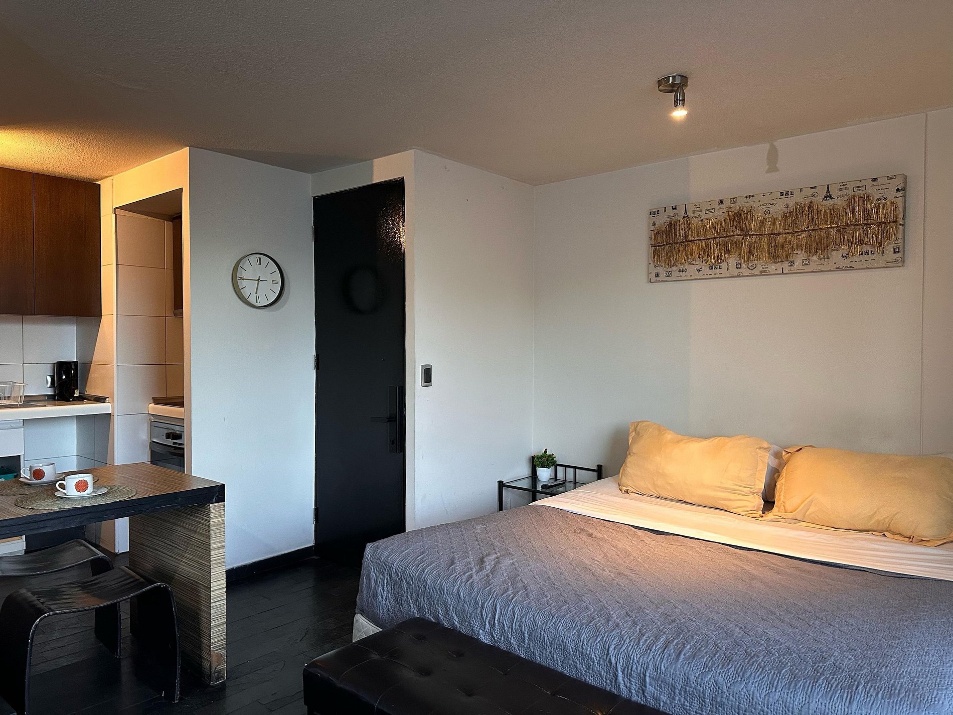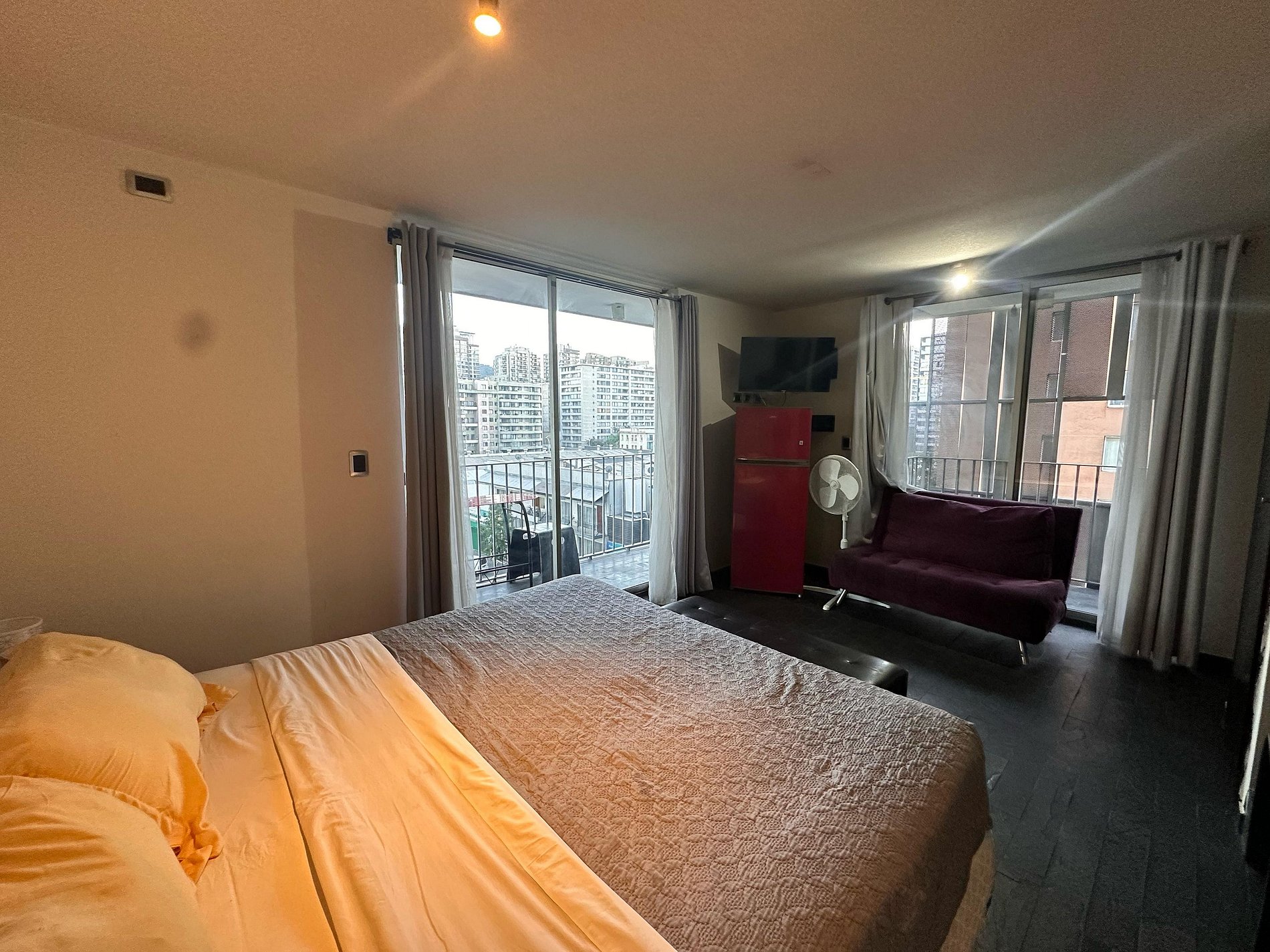 Avenida Portugal, Santiago Centro, Santa Isabel metro station 350m away, Católica metro station 700m away. Studio with double bed, one full bathroom, equipped kitchenette. Free WiFi in the apartment. Fan, electric stove, towels, iron, hair dryer and bed linen included.