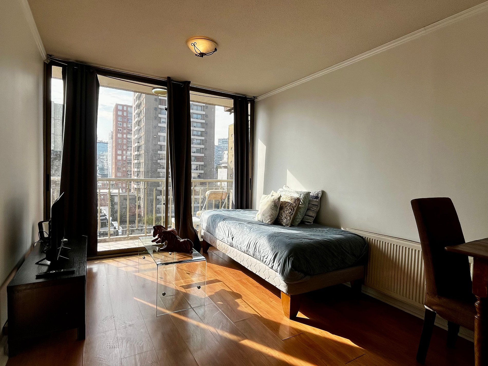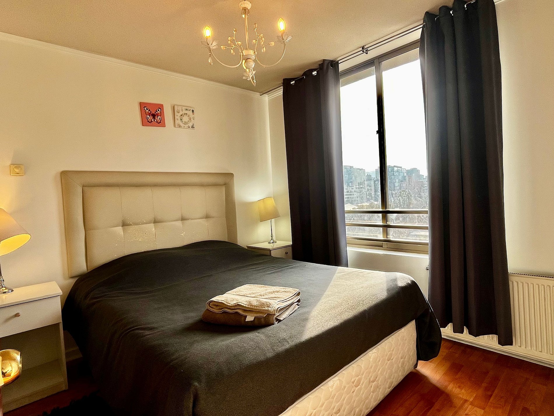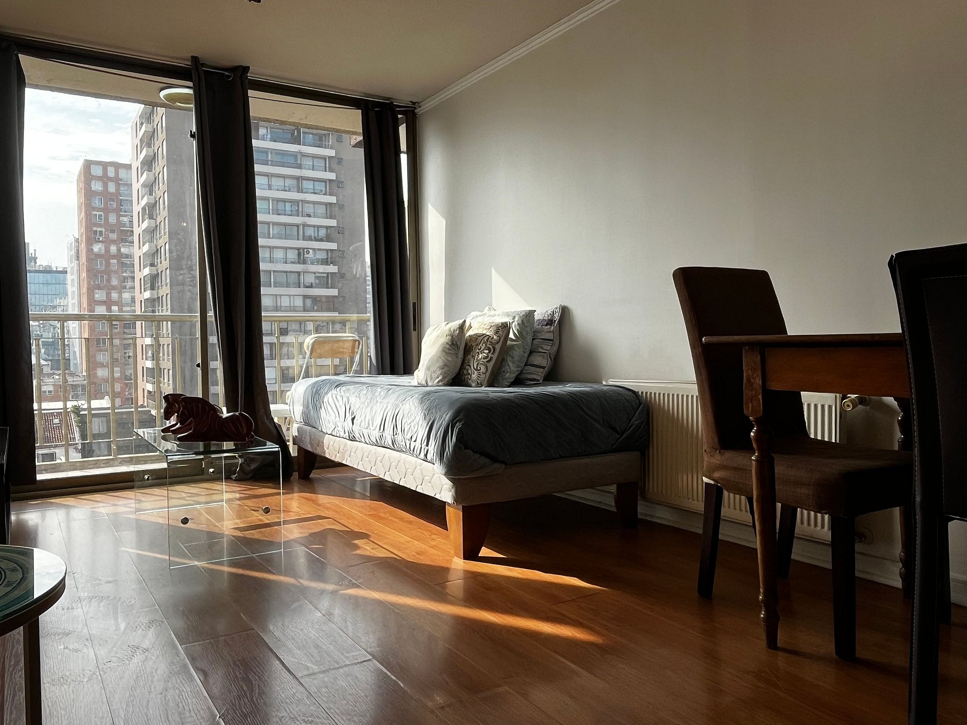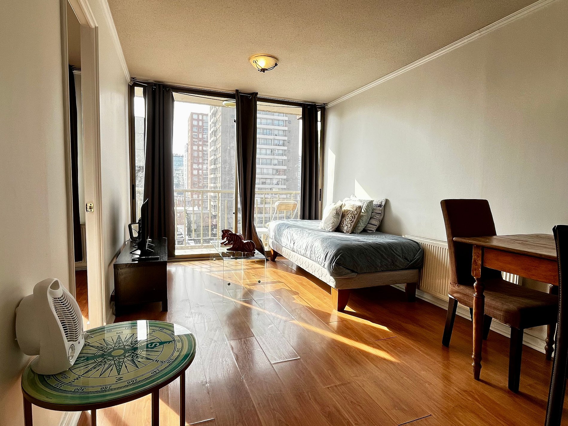 Almirante Pastene con Providencia. 2 ambientes, 1 dormitorio con una cama matrimonial , en el living una cama individual, 1 balcón, un baño con ducha en bañera , cocina pequeña pero full equipada. WiFi gratuita en el departamento. Ventilador, estufa eléctrica, toallas, plancha de ropa, secador de pelo y ropa de cama incluidos.