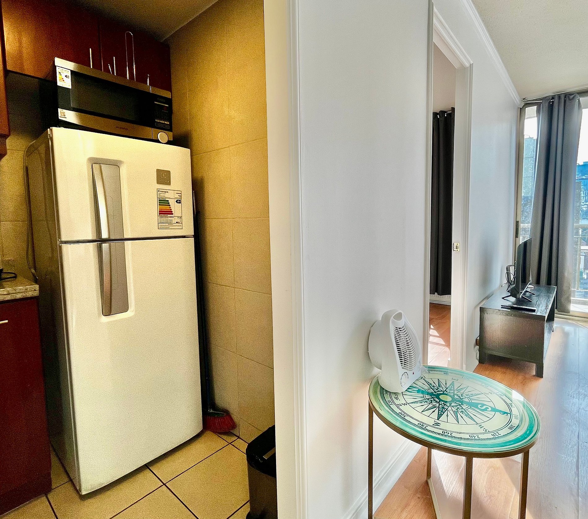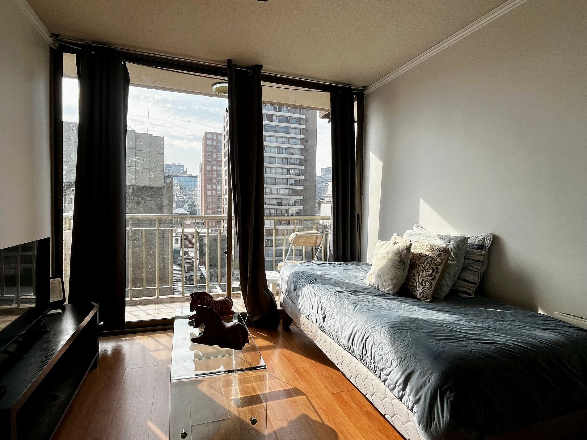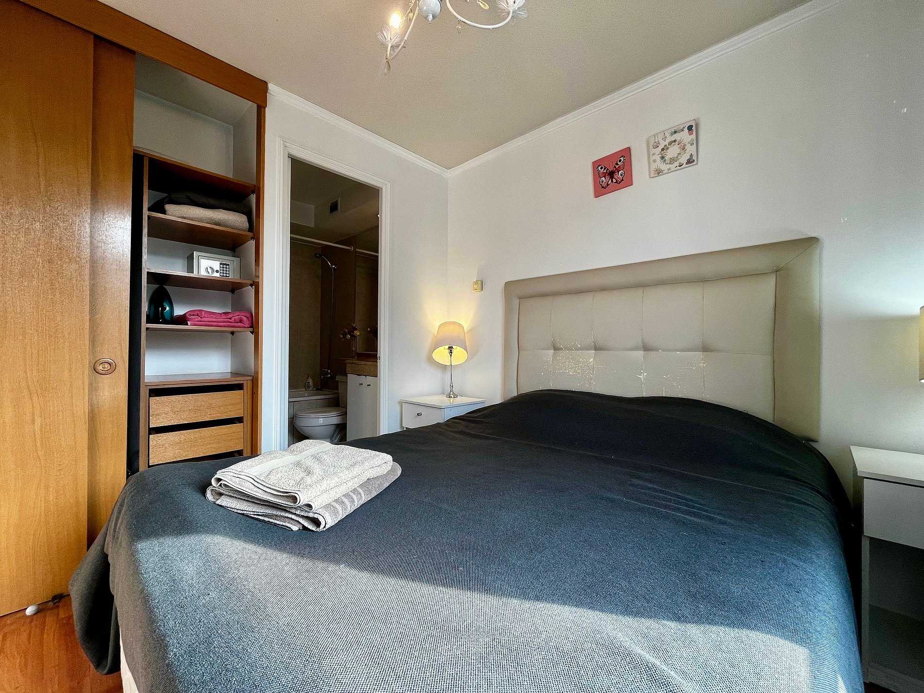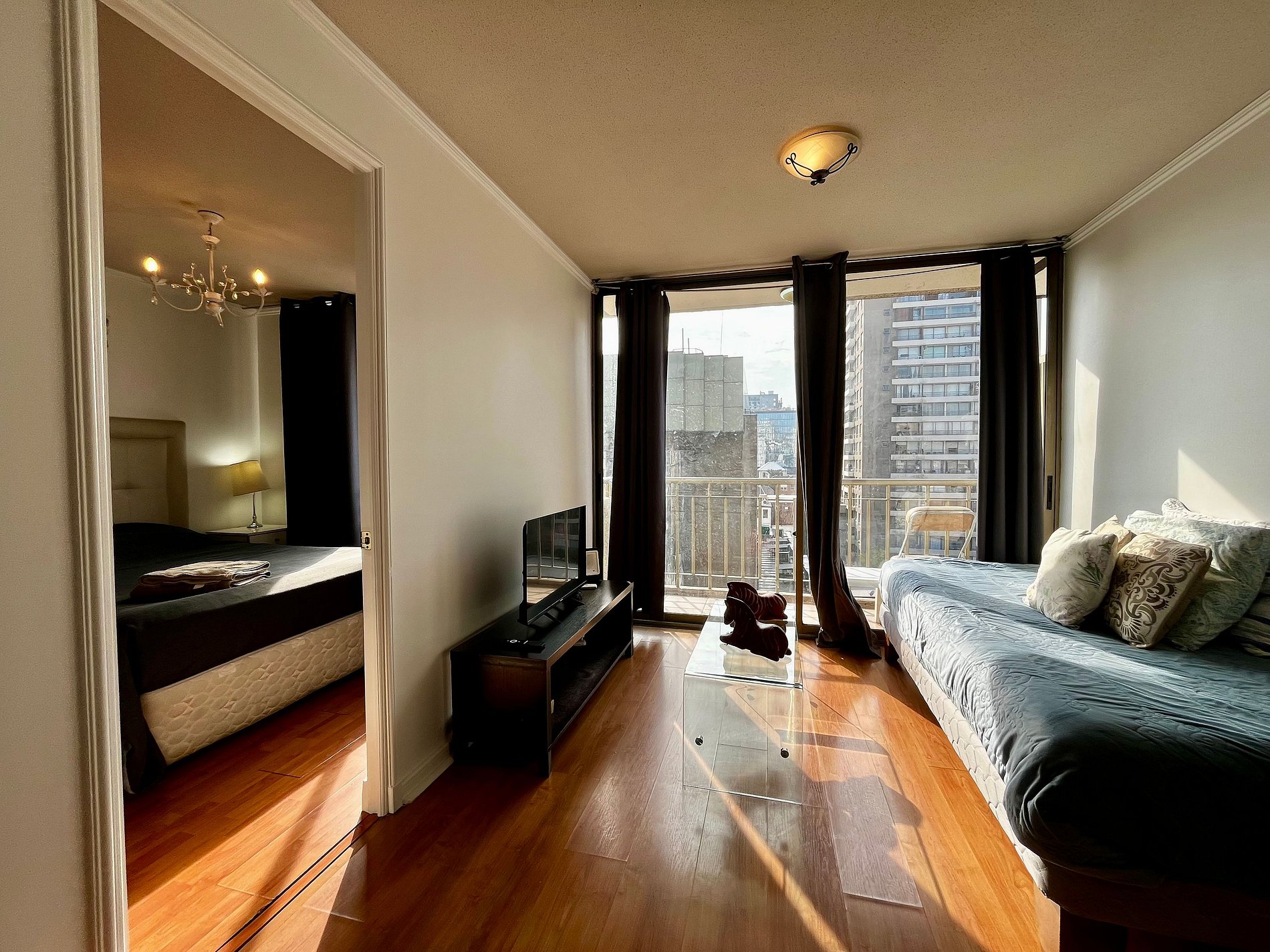 Almirante Pastene con Providencia. 2 ambientes, 1 dormitorio con una cama matrimonial , en el living una cama individual, 1 balcón, un baño con ducha en bañera , cocina pequeña pero full equipada. WiFi gratuita en el departamento. Ventilador, estufa eléctrica, toallas, plancha de ropa, secador de pelo y ropa de cama incluidos.