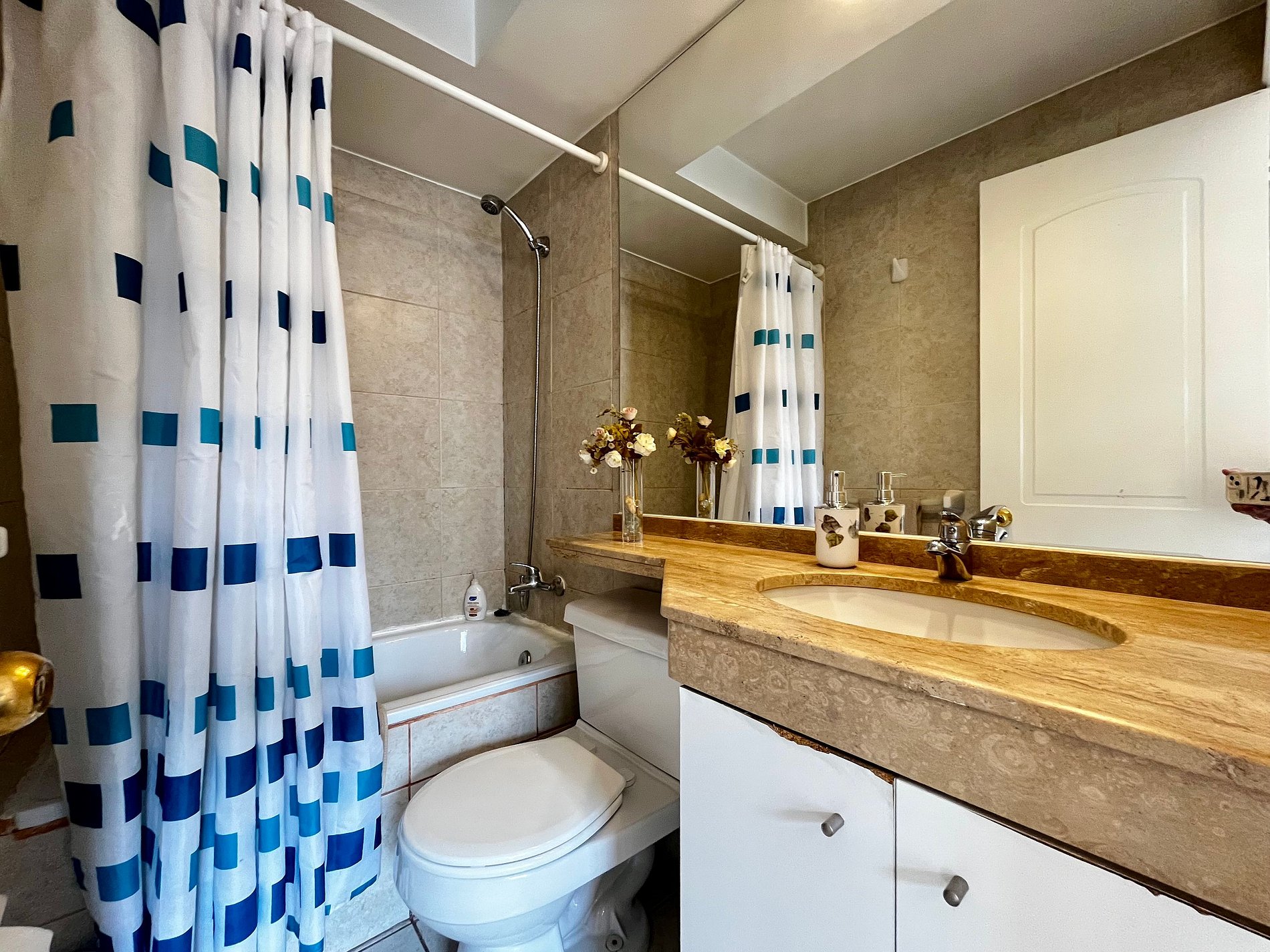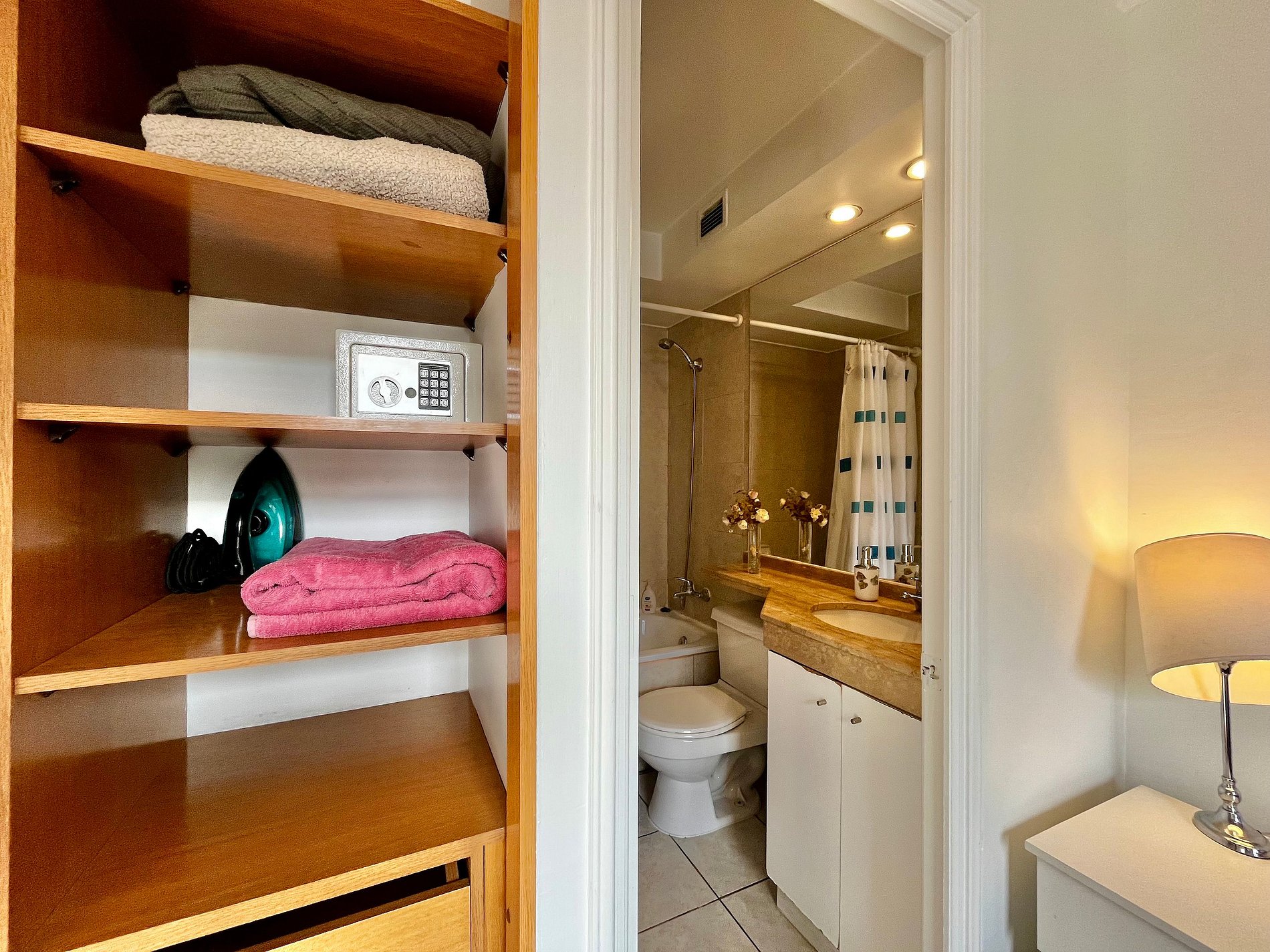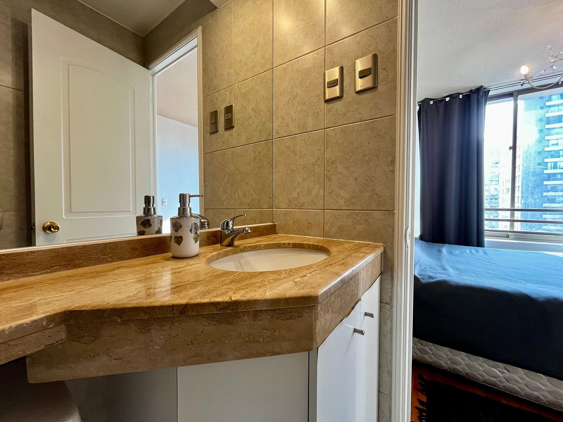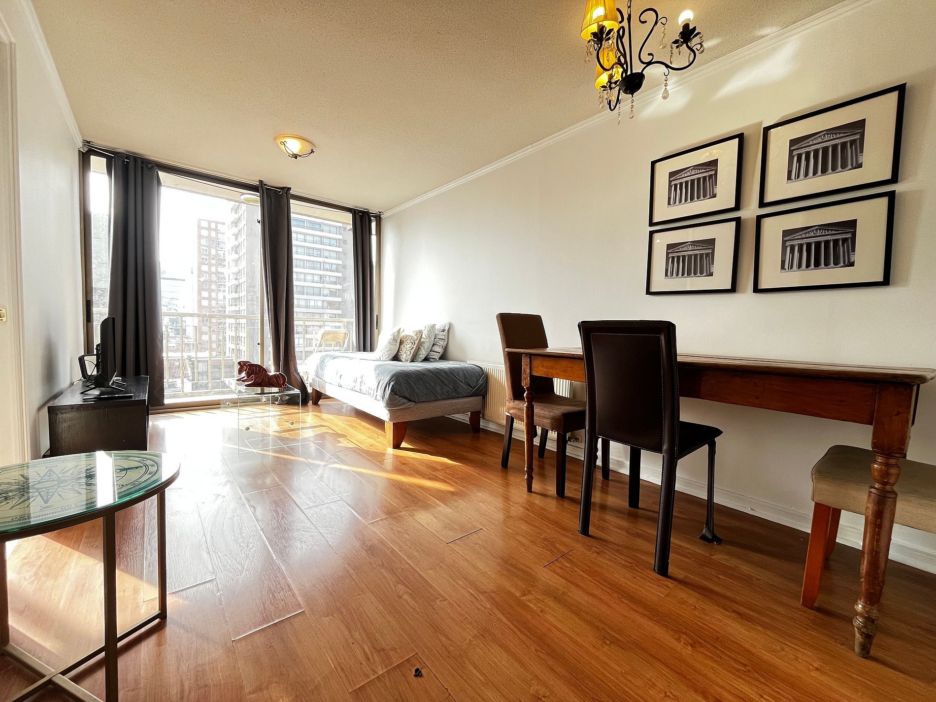 Almirante Pastene con Providencia. 2 ambientes, 1 dormitorio con una cama matrimonial , en el living una cama individual, 1 balcón, un baño con ducha en bañera , cocina pequeña pero full equipada. WiFi gratuita en el departamento. Ventilador, estufa eléctrica, toallas, plancha de ropa, secador de pelo y ropa de cama incluidos.