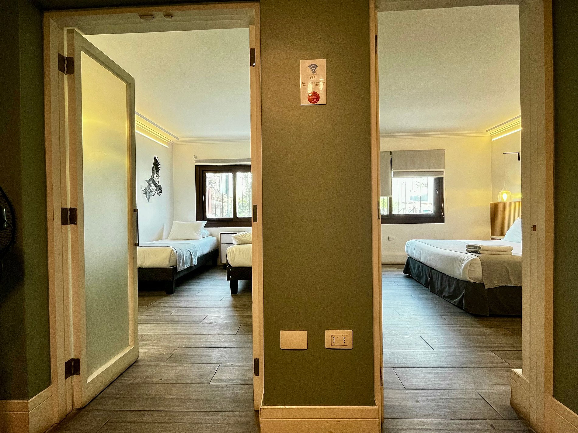 Las puertas se abren con sistema de claves únicas para cada reserva. WiFi de alta velocidad gratuita en todo el edificio. Ventilador, estufa eléctrica, toallas, plancha de ropa, secador de pelo y ropa de cama incluidos.