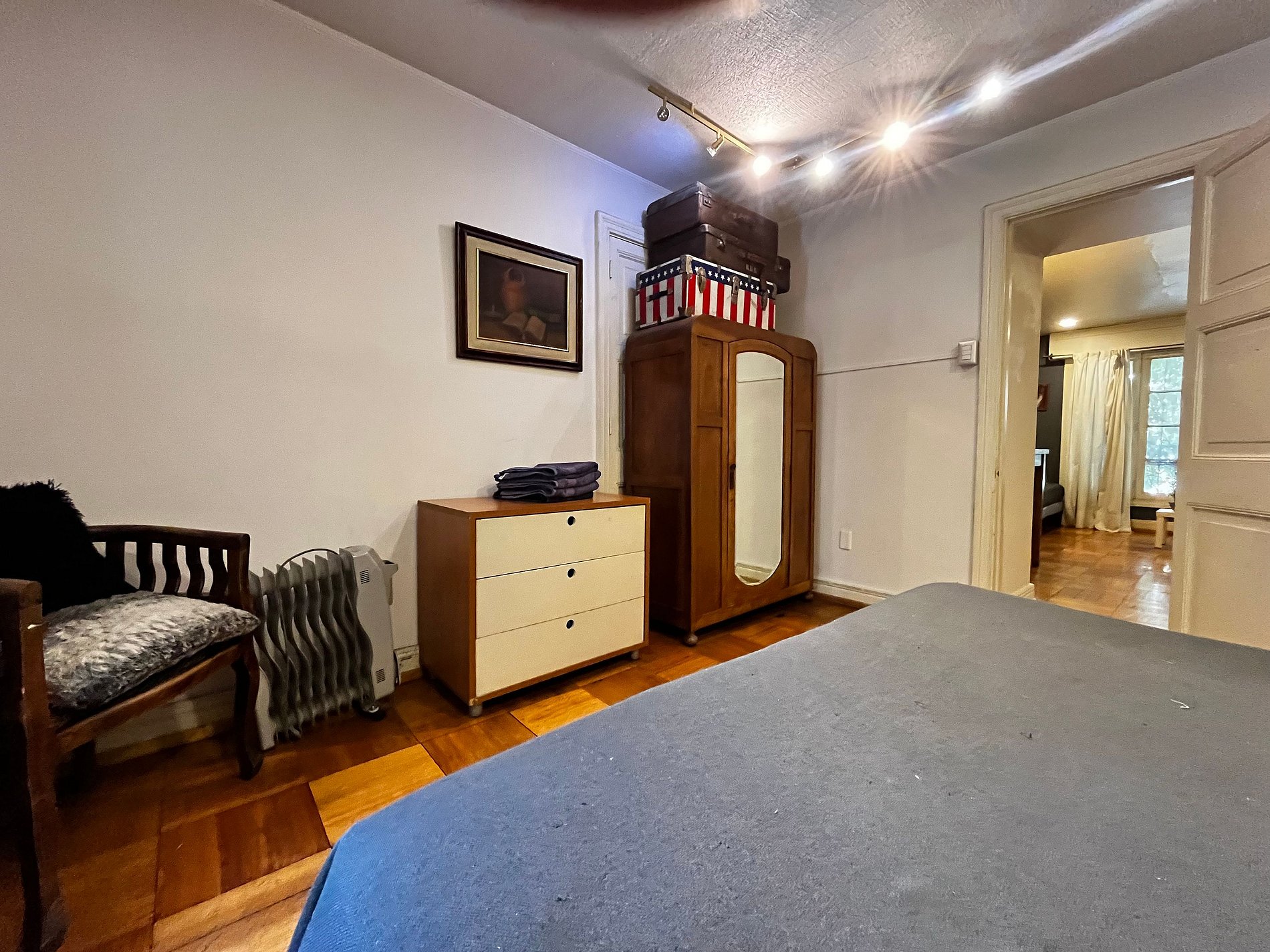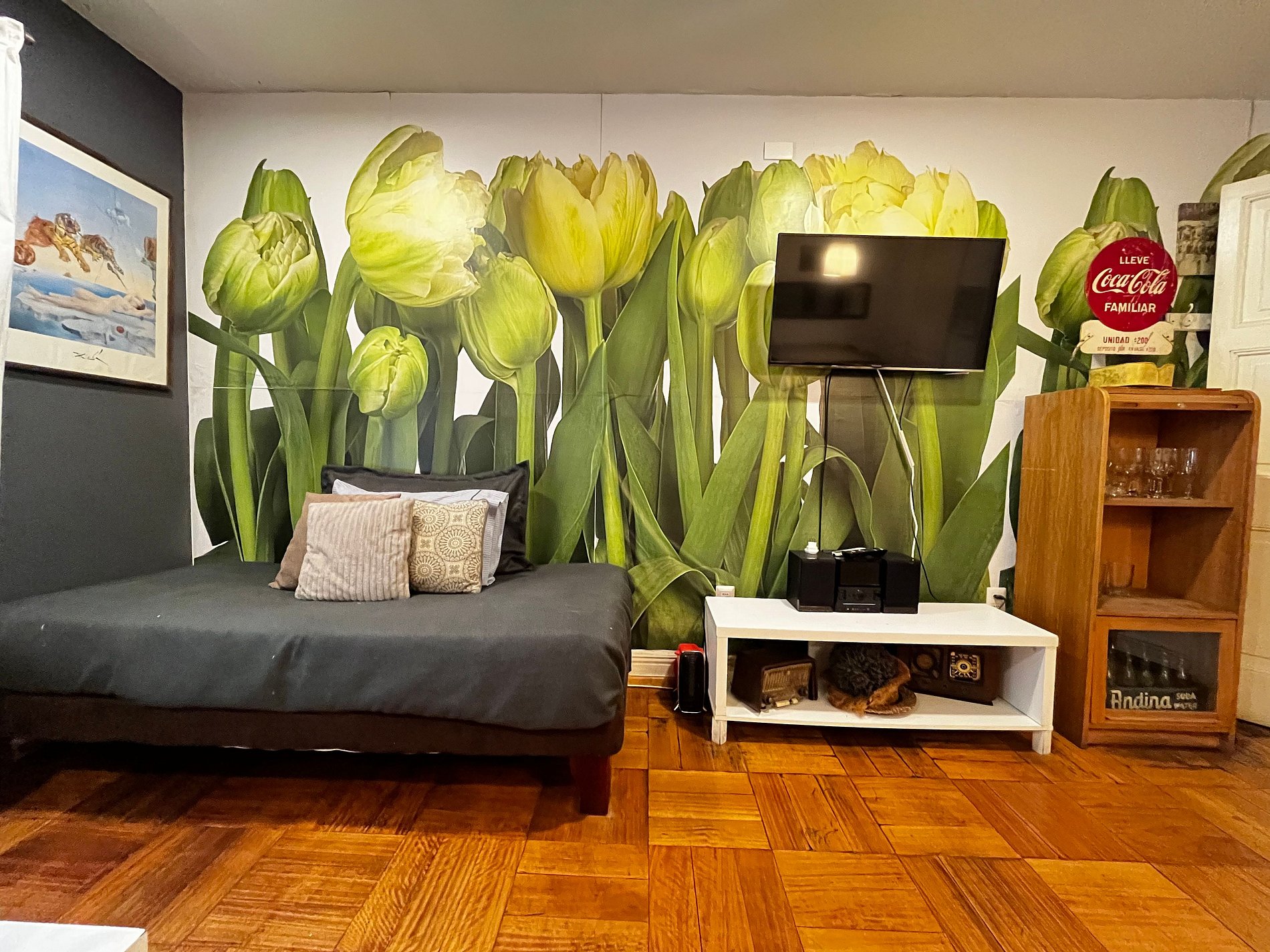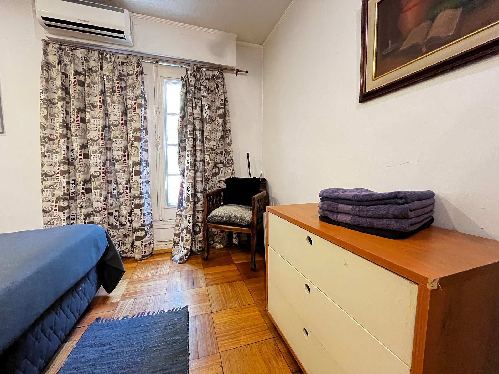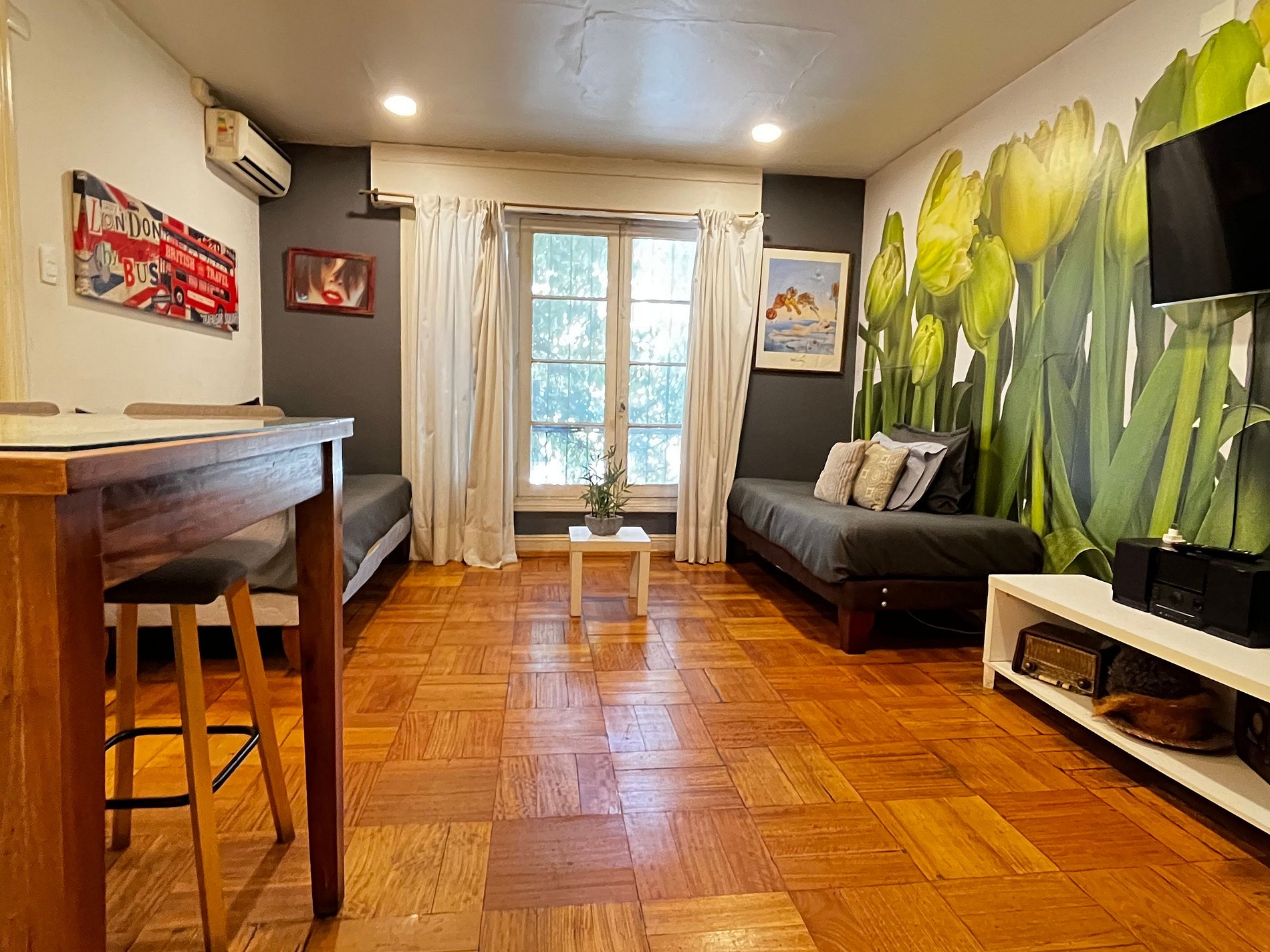 Calle Huelen, Providencia. 2 ambientes, un dormitorio, cama matrimonial king size en el dormitorio y dos camas individuales en el living, un baño con ducha en bañera, cocina pequeña equipada. WiFi gratuita en el departamento. Tv Cable, aire acondicionado frío calor en los 2 ambientes, toallas, plancha de ropa, secador de pelo y ropa de cama incluidos.