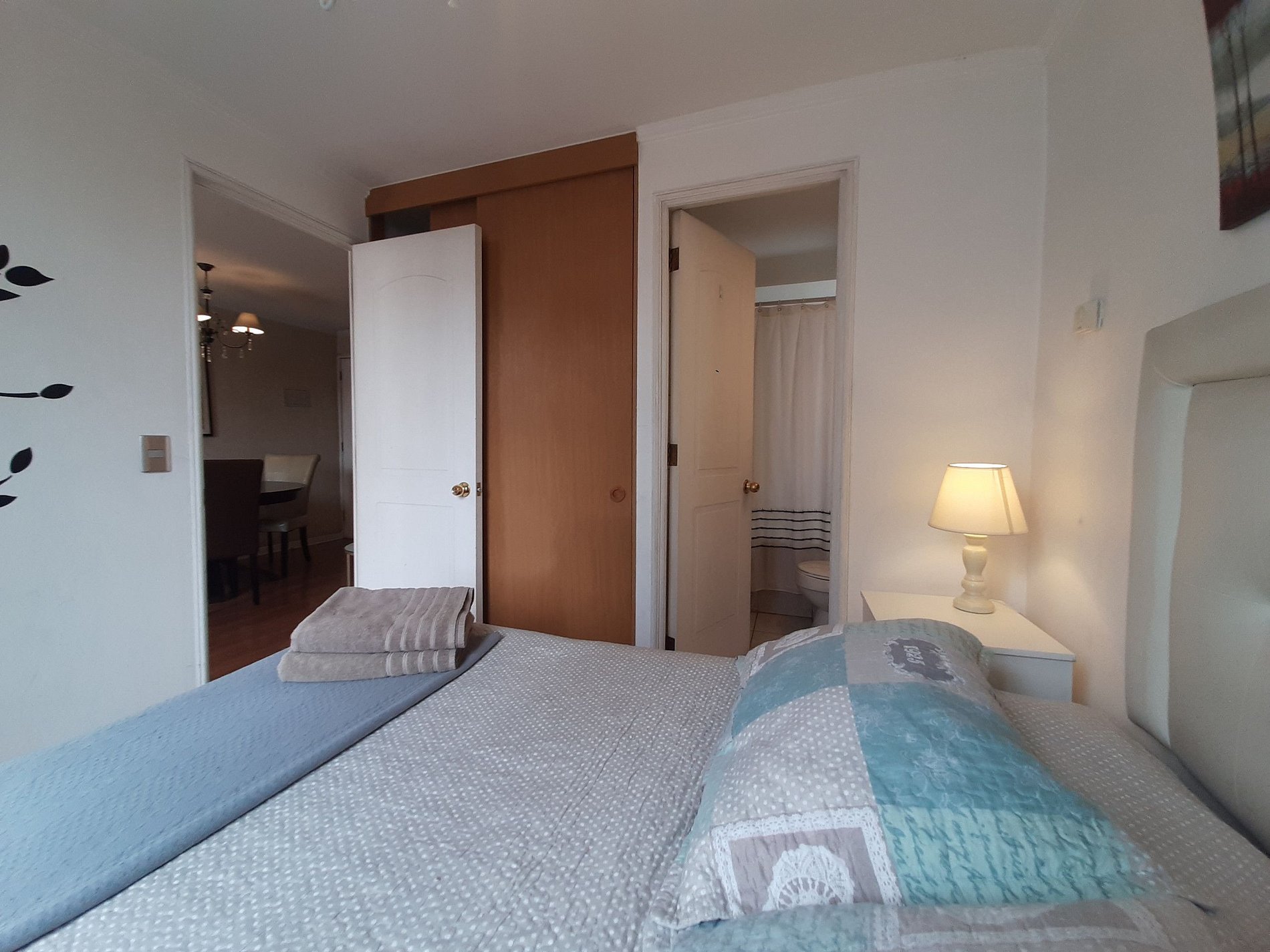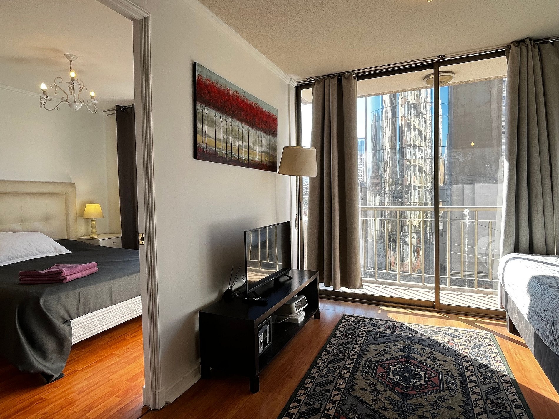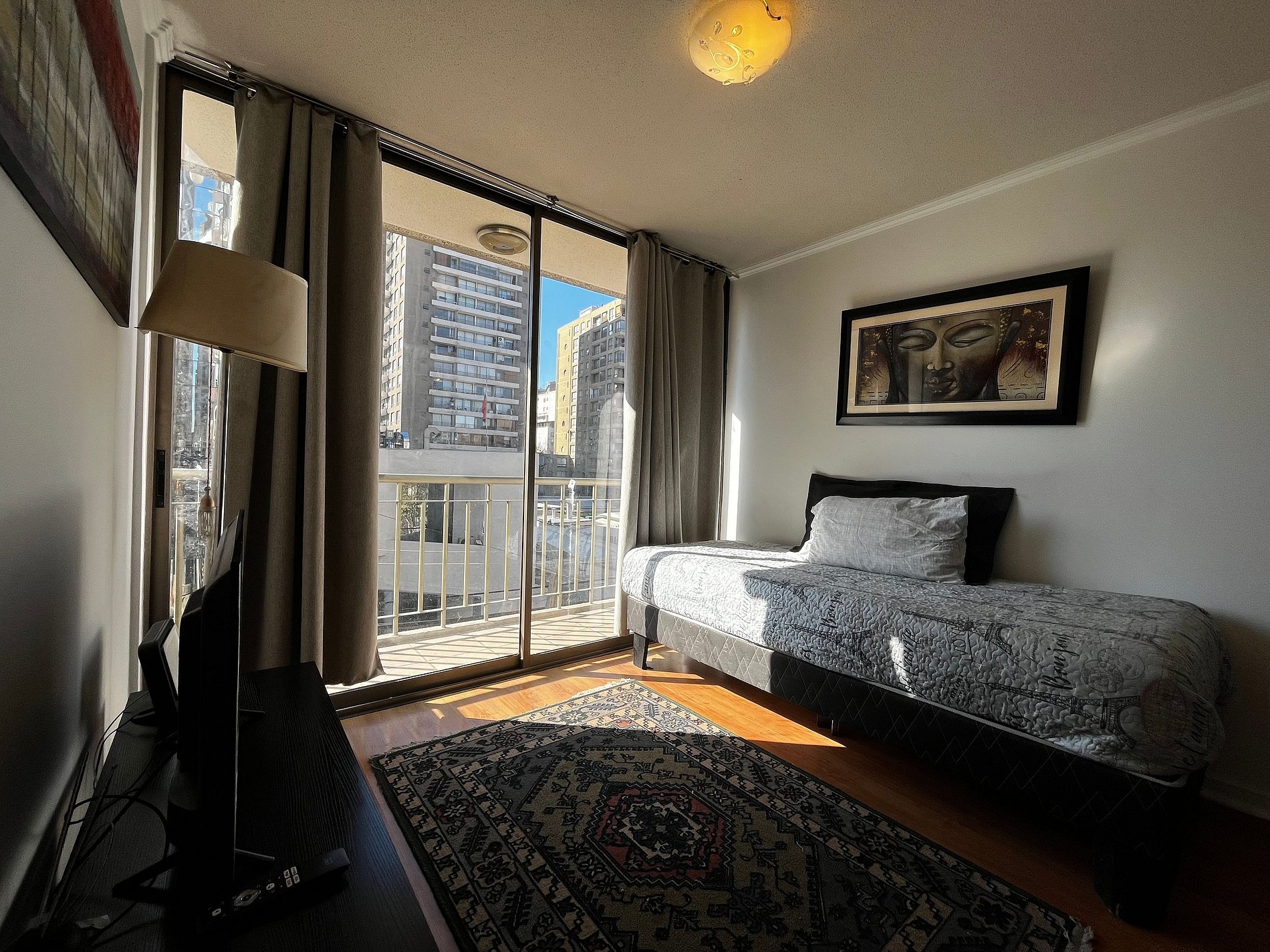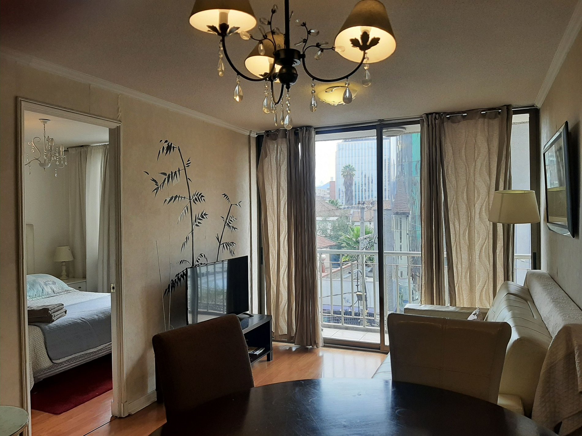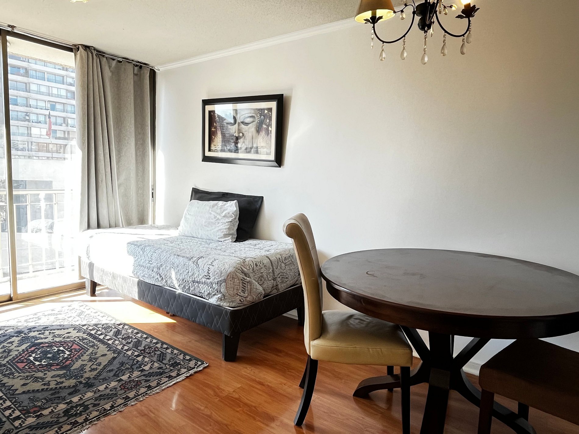Almirante Pastene con Providencia. 2 ambientes, 1 dormitorio con una cama matrimonial , en el living una cama individual, 1 balcón, un baño con ducha en bañera , cocina pequeña pero full equipada. WiFi gratuita en el departamento. Tv en el living. Ventilador, estufa eléctrica, toallas, plancha de ropa, secador de pelo y ropa de cama incluidos.