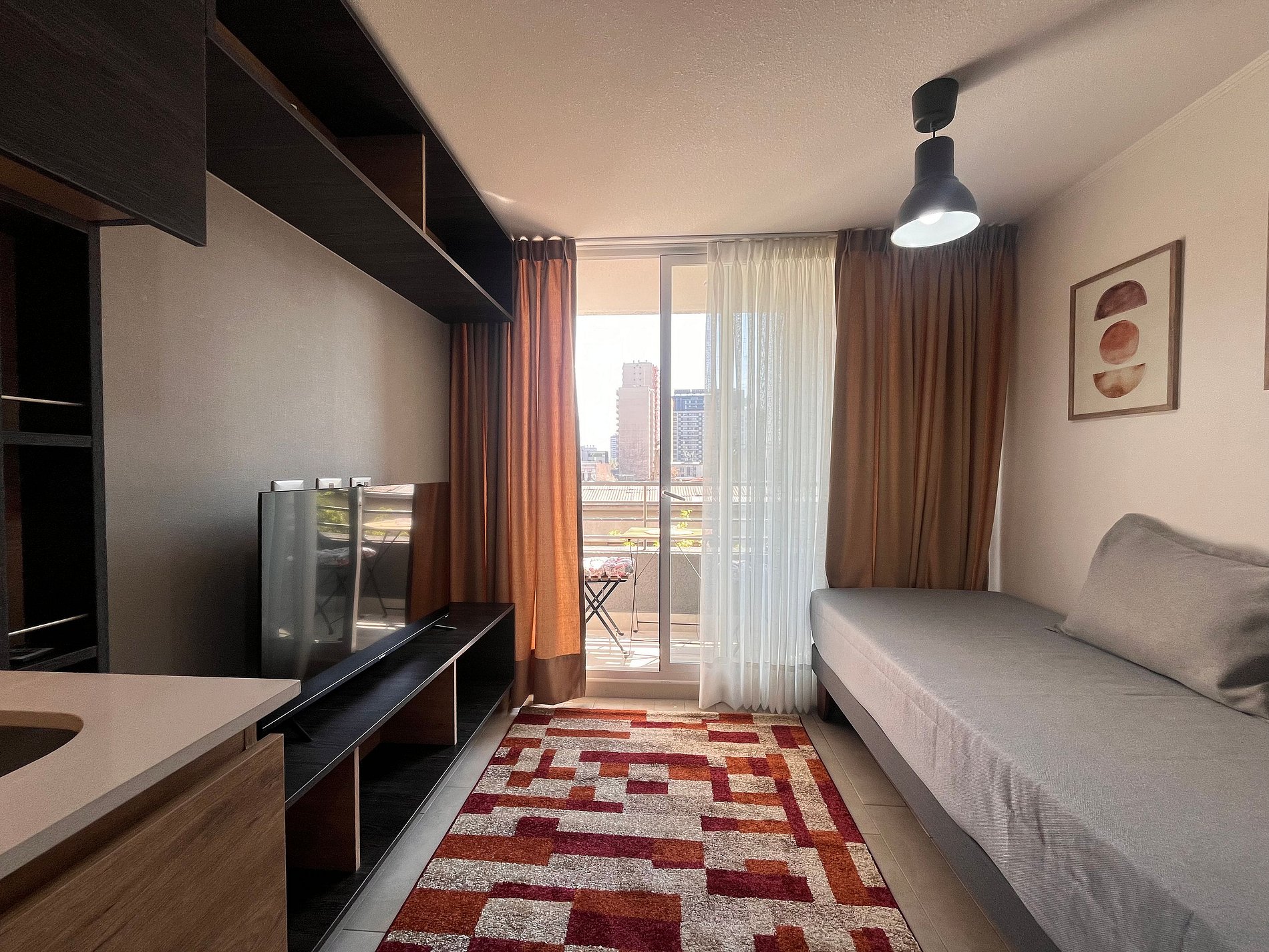 Calle Rosas, Santiago Centro ,estación de metro Plaza de Armas a 350m. Un dormitorio con cama doble y una cama individual en el living, un baño con ducha en bañera, cocina pequeña equipada. WiFi gratuita en el departamento. Ventilador, estufa eléctrica, toallas, plancha de ropa, secador de pelo y ropa de cama incluidos.