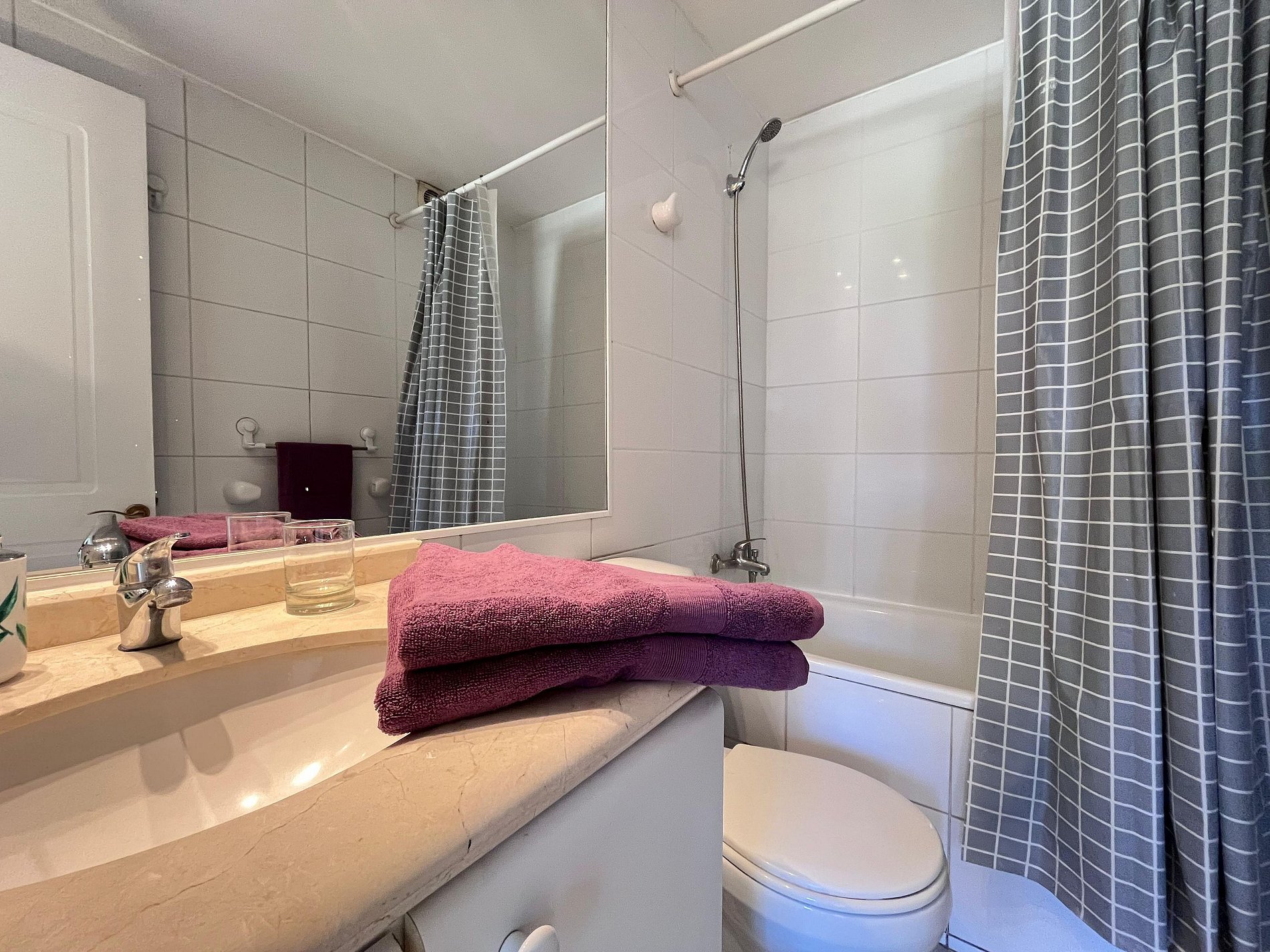 Av Manuel Montt con Nva Providencia. 2 ambientes, 1 dormitorio con una cama matrimonial , en el living una cama individual, 1 balcón, un baño con ducha en bañera , cocina americana full equipada. WiFi gratuita en el departamento. Ventilador, estufa eléctrica, toallas, plancha de ropa, secador de pelo y ropa de cama incluidos.