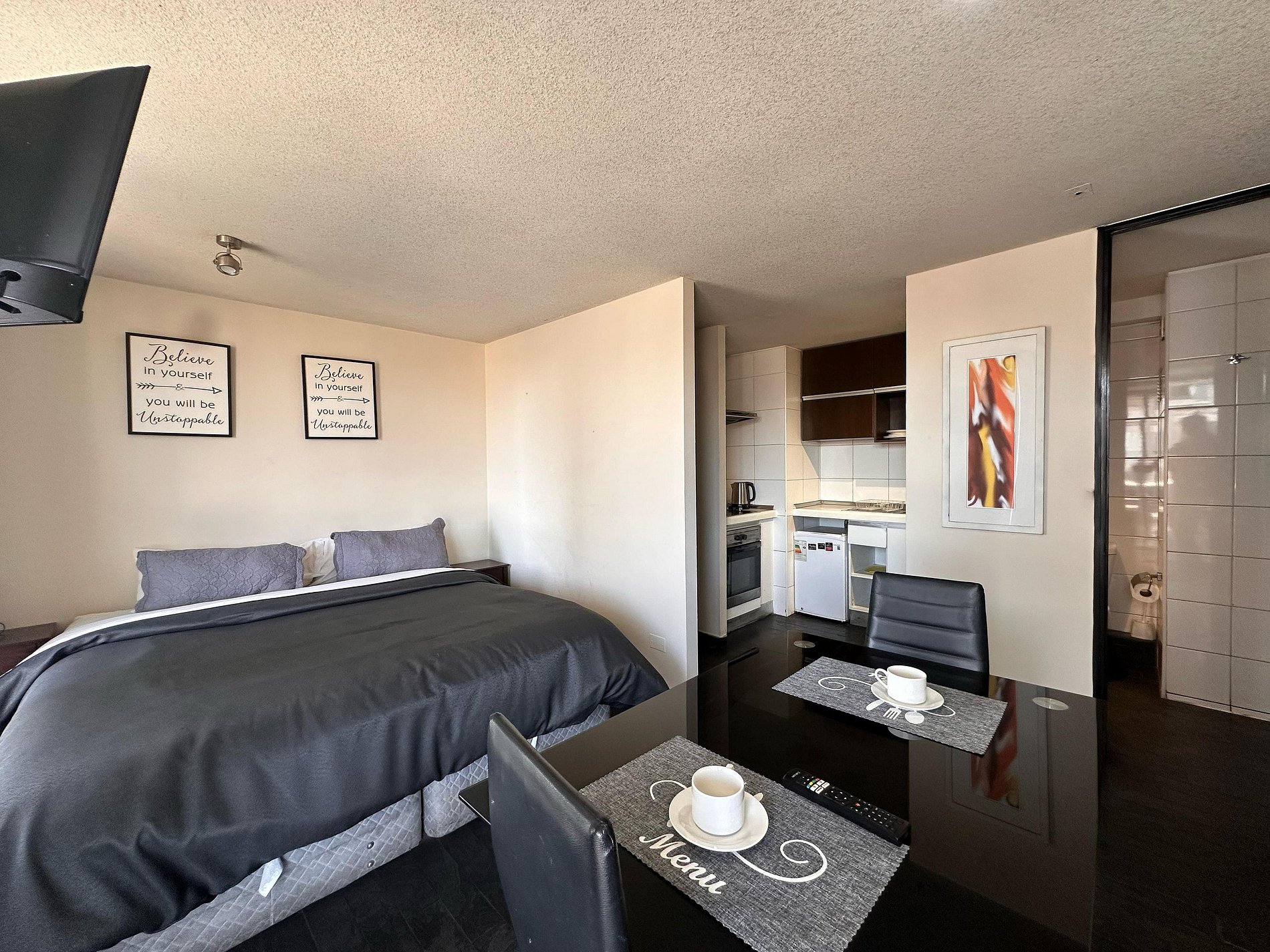 Este departamento es muy cómodo para una o dos personas. Es un ambiente amplio, cocina pequeña pero precis para cocina básica, cama muy cómoda, televisor e internet de buena calidad. También tiene un balcón amplio. Buen sector cerca del metro