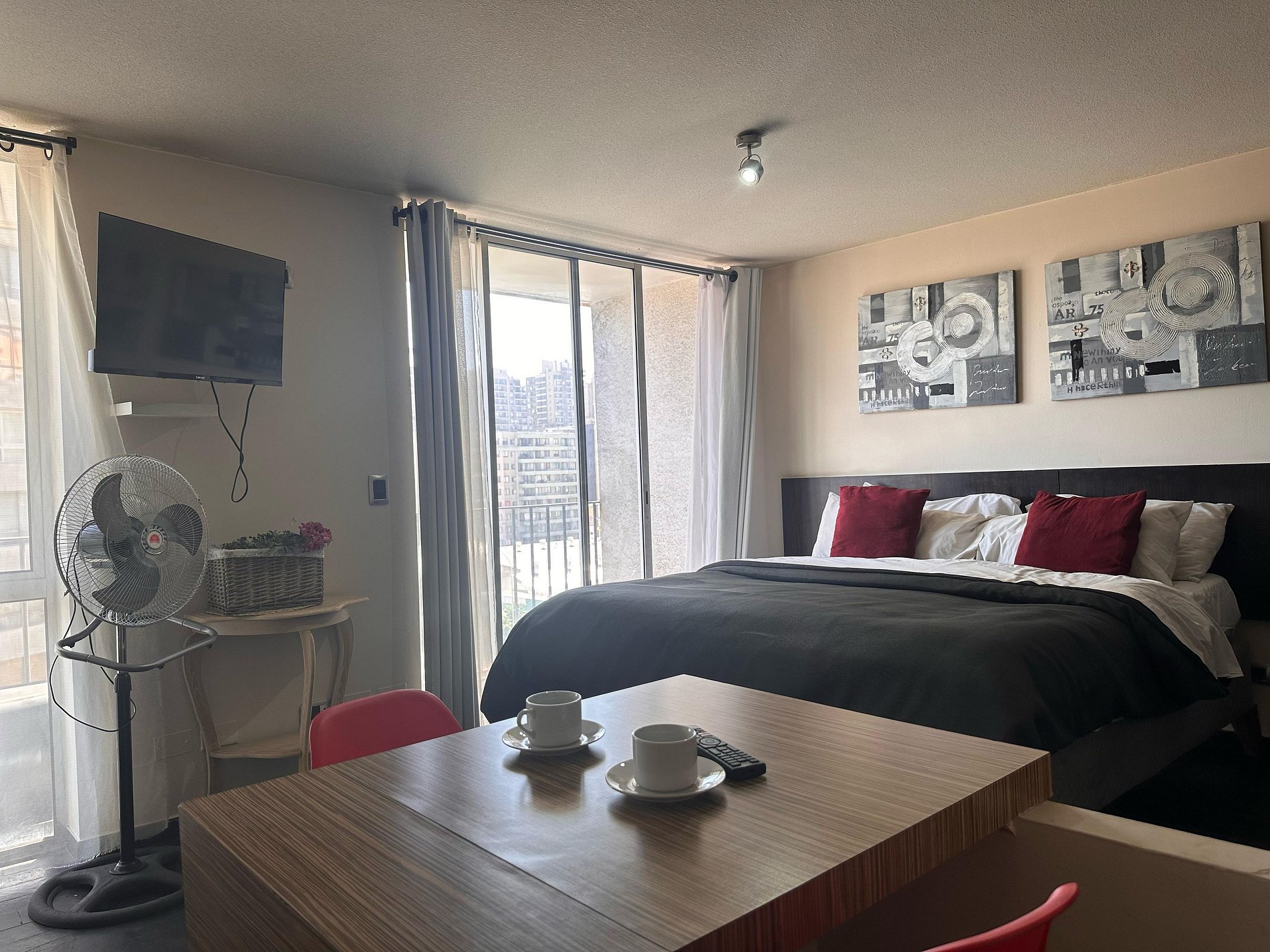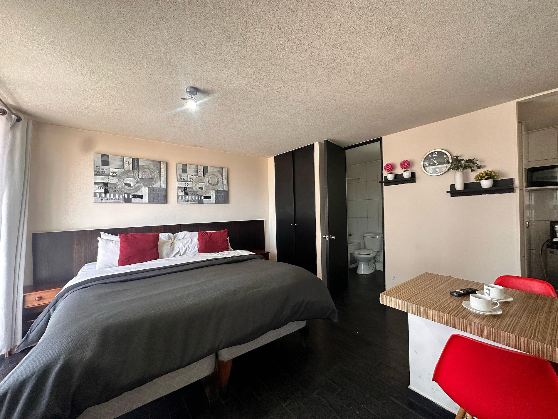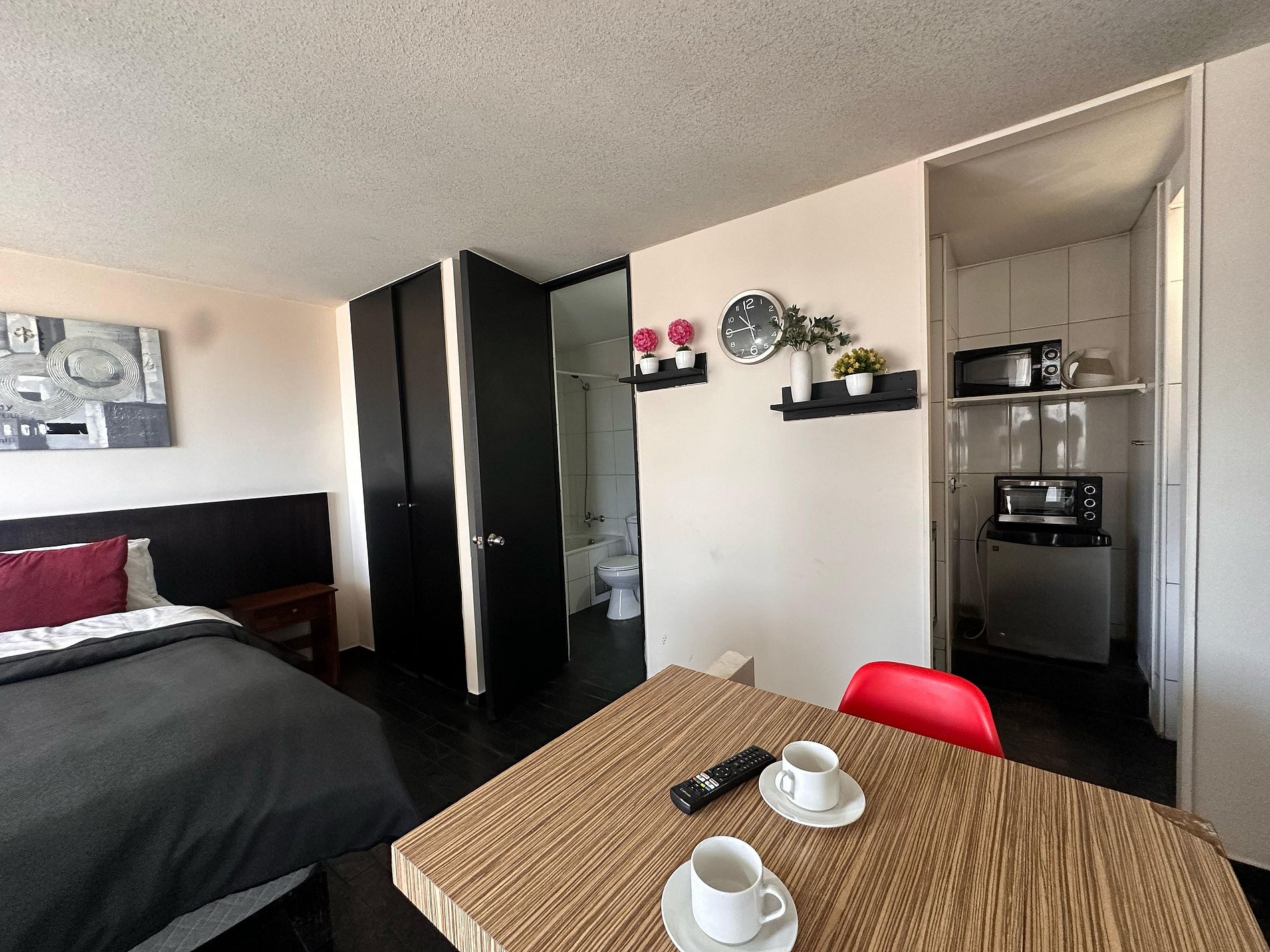 Avenida Portugal , Santiago Centro ,estación de metro Santa Isabel a 350m, Metro Católica a 700m. Estudio con cama matrimonial, un baño completo, cocina pequeña equipada. WiFi gratuita en el departamento. Ventilador, estufa eléctrica, toallas, plancha de ropa, secador de pelo y ropa de cama incluidos.