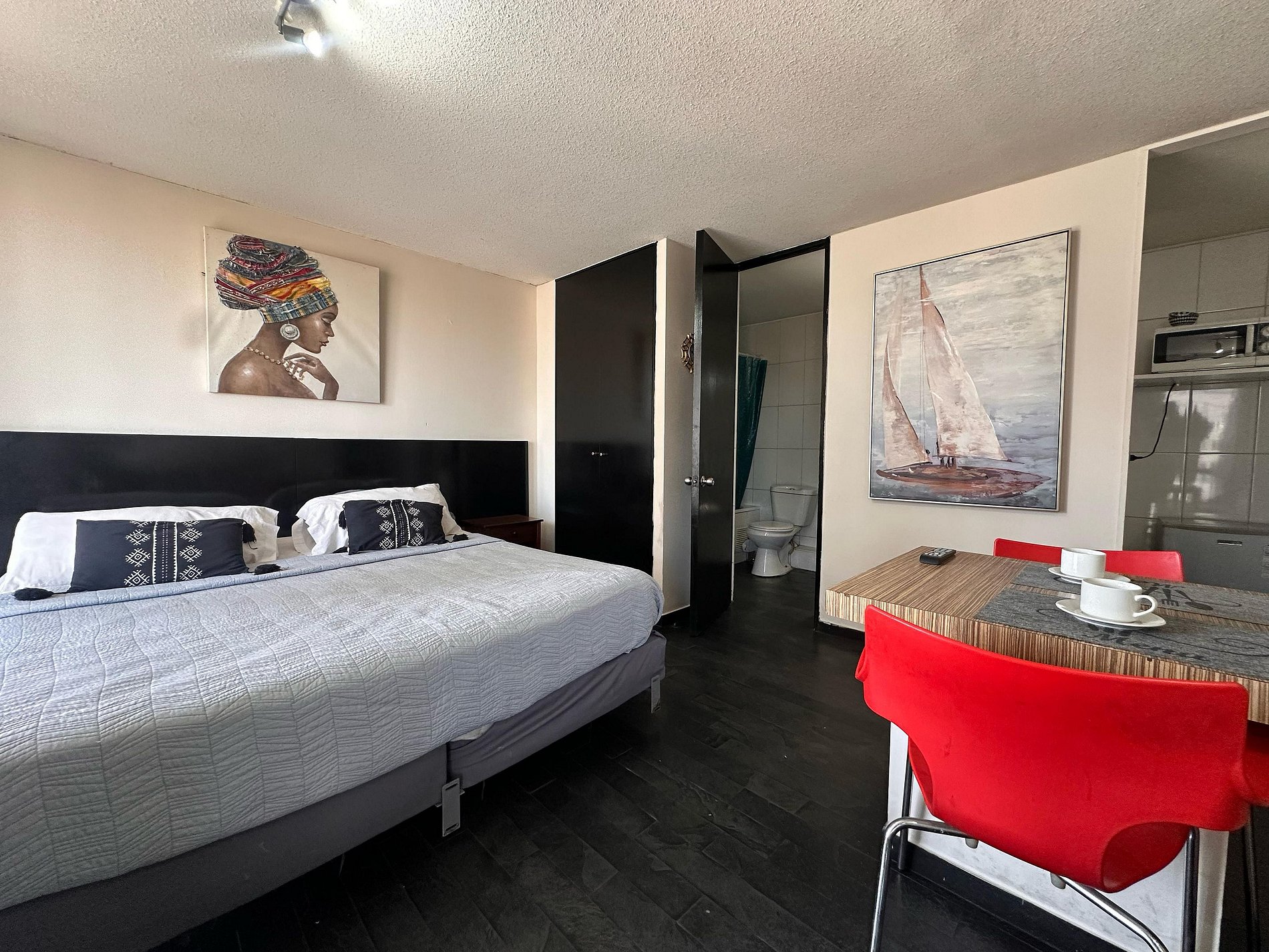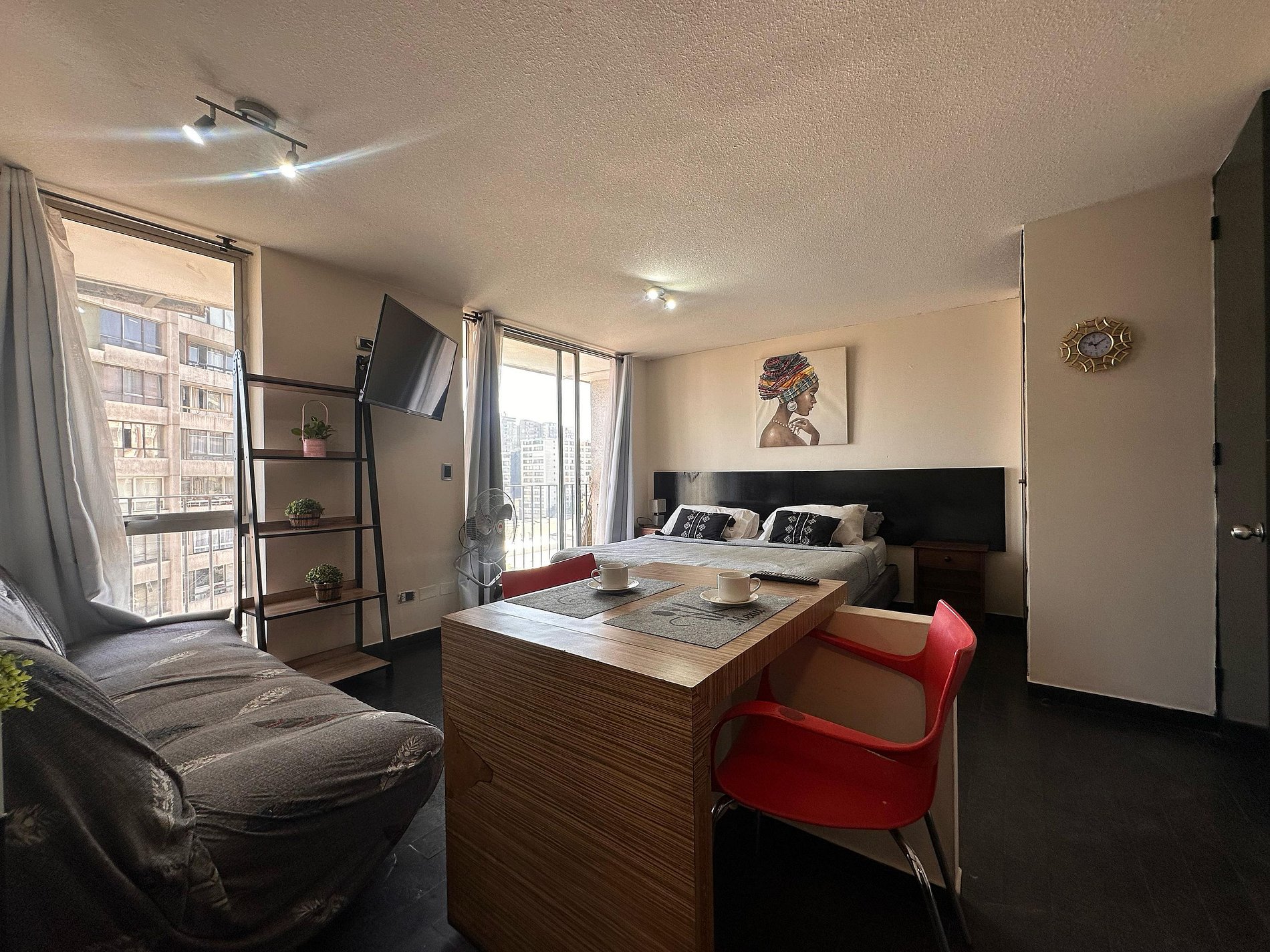 Avenida Portugal , Santiago Centro ,estación de metro Santa Isabel a 350m, Metro Católica a 700m. Estudio con cama matrimonial más una cama individual , un baño completo, cocina pequeña equipada. WiFi gratuita en el departamento. Ventilador, estufa eléctrica, toallas, plancha de ropa, secador de pelo y ropa de cama incluidos.
